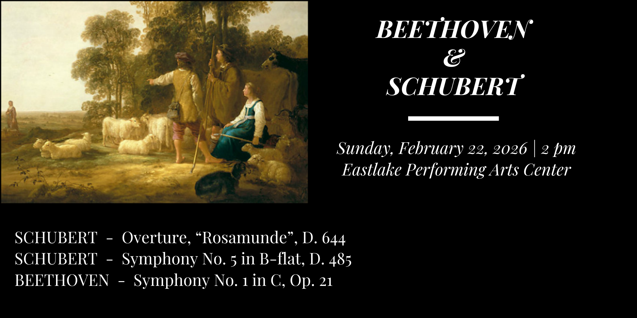 Eastlake Performing Arts CenterHistorians are divided on whether they actually met face-to-face, but Ludwig van Beethoven and Franz Schubert were definitely a mutual admiration society based on their music. After seeing some of Schubert's scores, Beethoven remarked that the younger composer had "the divine spark of genius"; Schubert revered Beethoven above all other composers and asked at the end of his tragically short life to be buried as close to Beethoven as possible. This concert gives audiences the opportunity to savor two of these geniuses' symphonies back-to-back: Schubert's Symphony No. 5 (written at the age of 19) and Beethoven's Symphony No. 1 (from his 29th year). The concert opens with Schubert's rousing overture to Rosamunde.